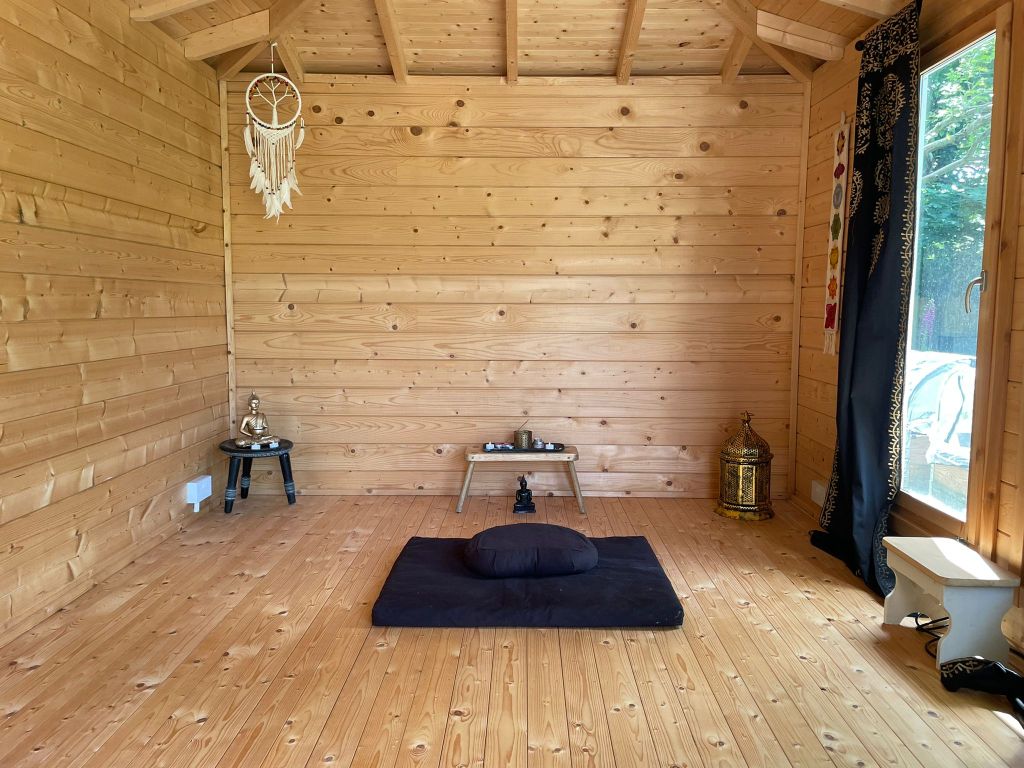 The construction of Bluebell Cabin began as a summer house but I soon realised that this would be the most perfect place to teach yoga, breathwork and meditation. It is nestled under the trees at the bottom of the garden and is surrounded by bluebells in the spring. It is a peaceful retreat overlooking ancient woodland, a site of significant scientific interest (SSSI) and the upper reaches of the River Hamble, called Curbridge Creek.
